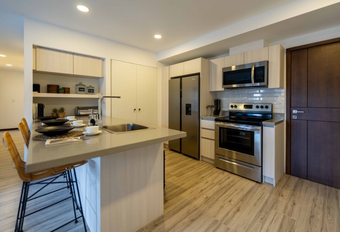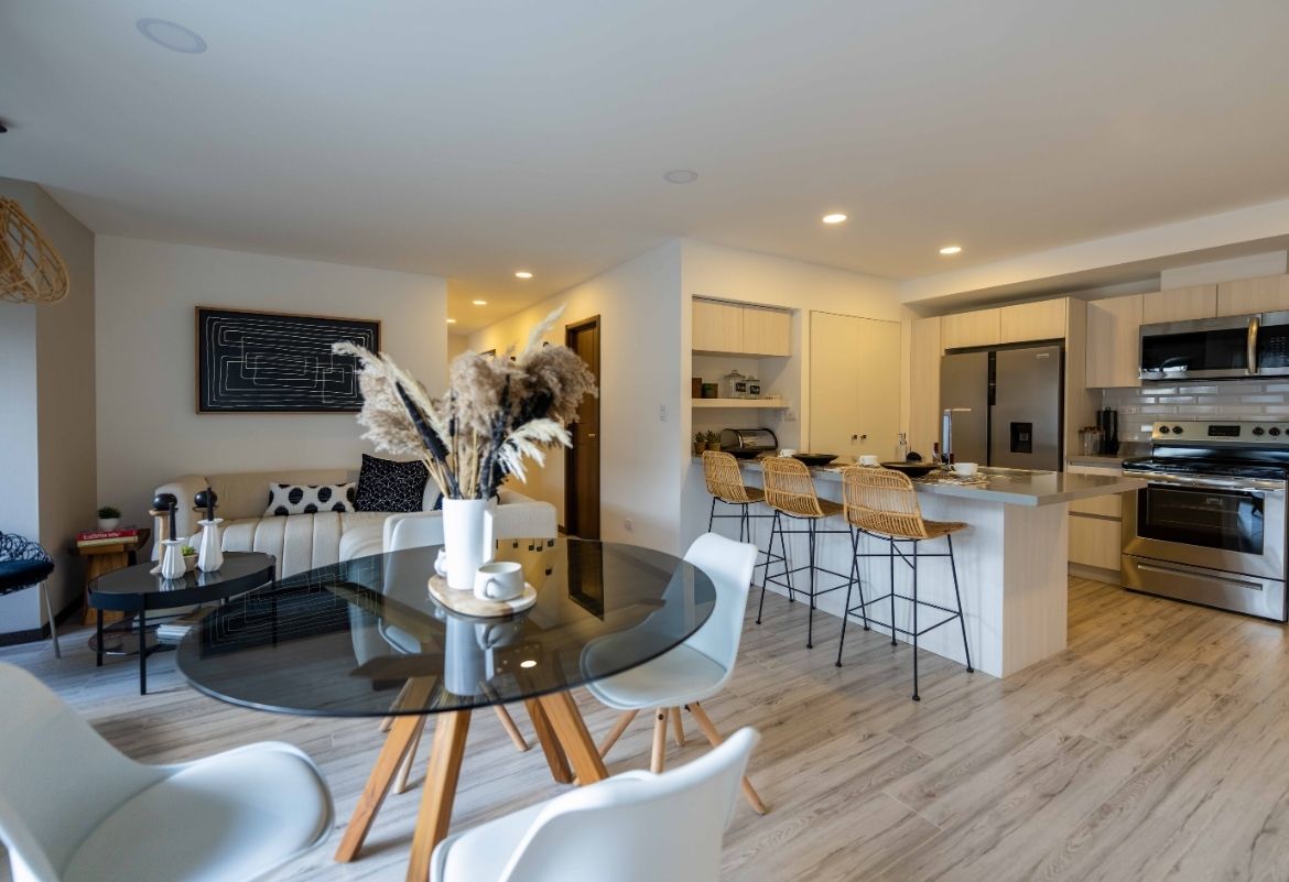 Conoce nuestro apartamento modelo: En NEO 2 cada detalle ha sido cuidadosamente pensado para ti. Al recibir tu apartamento encontrarás acabados de la más alta calidad: ventanas de tecnología alemana, puertas sólidas con diseño moderno, cocinas con tops de cuarzo con la garantía de SAXS, todo elegido por su durabilidad y por aportar a la sensación de amplitud de los apartamentos.