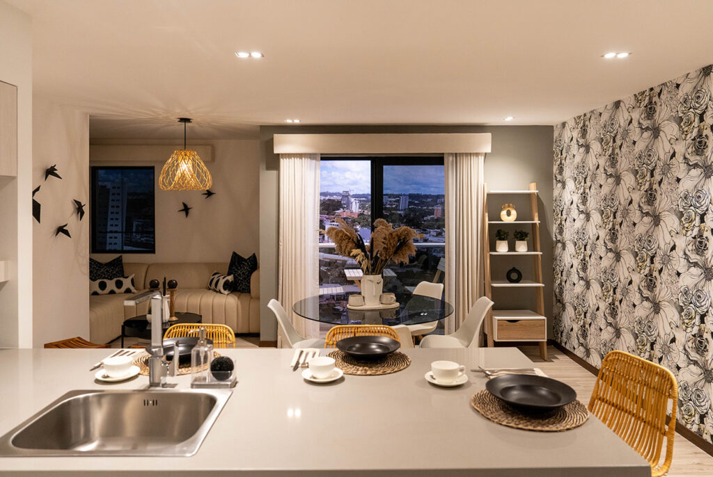 Conoce nuestro apartamento modelo: En NEO 2 cada detalle ha sido cuidadosamente pensado para ti. Al recibir tu apartamento encontrarás acabados de la más alta calidad: ventanas de tecnología alemana, puertas sólidas con diseño moderno, cocinas con tops de cuarzo con la garantía de SAXS, todo elegido por su durabilidad y por aportar a la sensación de amplitud de los apartamentos.
